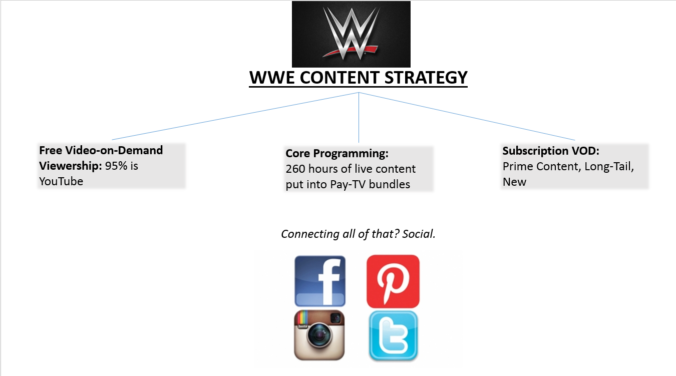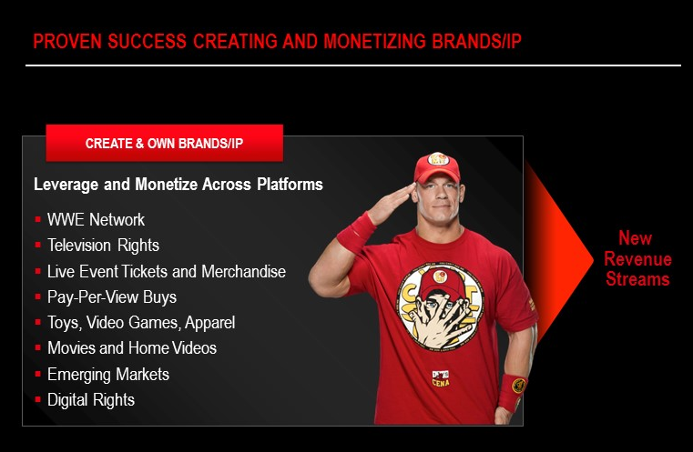 "At 50,000 foot level, WWE fairly traditional media model. It creates intellectual property (shows, superstars/divas) and then monetizes it across a variety of platforms (tickets, toys, t-shirts, video, advertising)."
