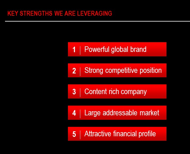 New content using our IP (Scooby Doo), new games (Immortal, Supercard), testing out at new ways to merchandise at live events where you can order from your device and pick it up to avoid the long lines. These initiatives are "singles" and "doubles". We think over time they will add up. The WWE Network was singularly the biggest innovation that we've done. There's been a lot of innovation between 2011-2014. As our deals were being renewed, we wanted to take advantage of that.