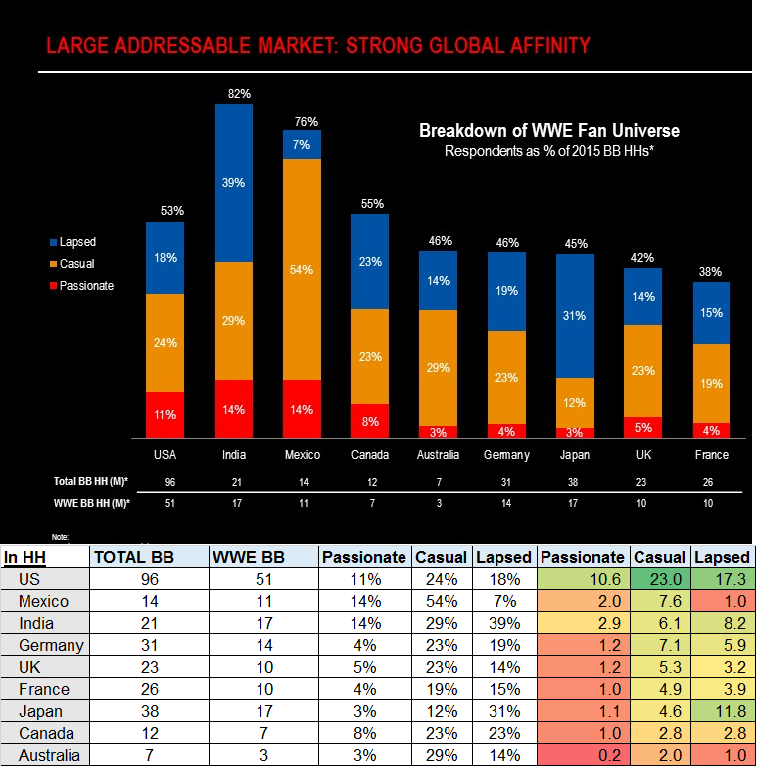 (Interesting to see the large number of lapsed fans in Japan. Also, the WWE Network hasn't officially launched in either Japan, India or Germany yet.)