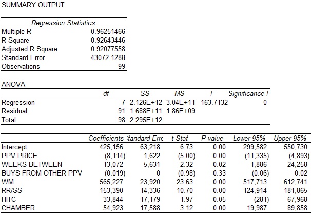 Pay-Per-View Buys were 7k to 10k for most events, right? Assuming 12 PPVs, that would be 102,000 buys annually (versus four million worldwide for WWE). My guess for 100k in PPV buys would be about $2.1M in PPV revenue (after the split with the cable companies).