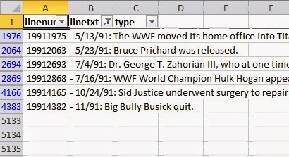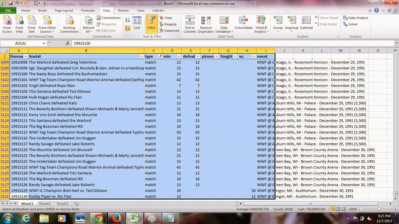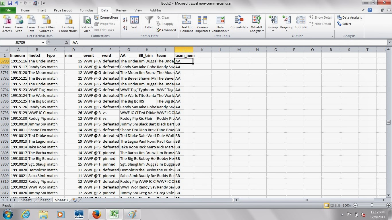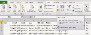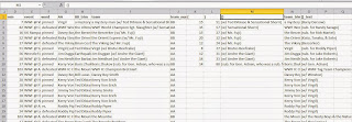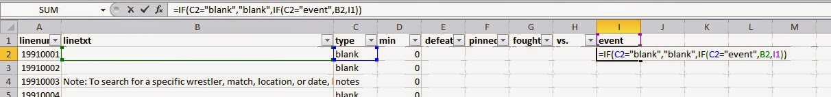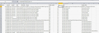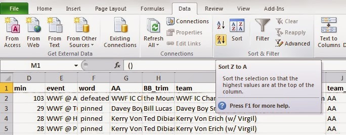 At this point, you should have a moderately usable dataset. You still need to remove some "false positives" (lines of data that aren't actually matches) or lines of data from events that weren't in your original federation (filter on column E