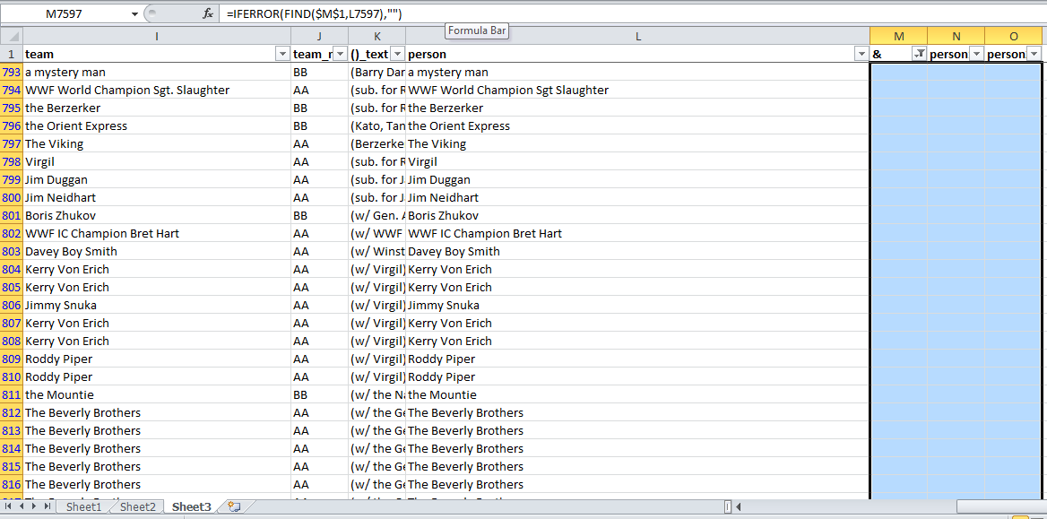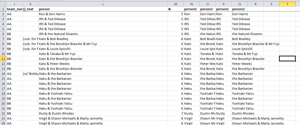 Column L is converting column I (team) in three ways: converting "and", "/" and "," to "&" and removing periods. Then we're splitting into two groups - a single person (column N) and the remaining people (column O).