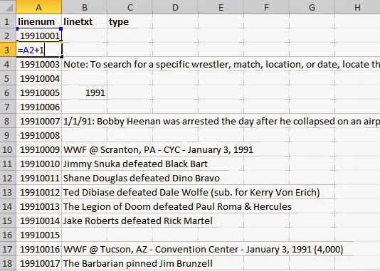 For the rest of column A, I use an equation to auto-number each line: A3 =