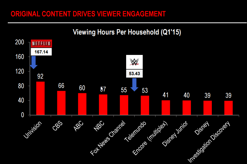 With stalwarts such as ESPN are in the middle trimming $100 million from their budget, already the narrative is moving from the “live sports are the DVR-proof bubble in a cord-cutting world” to “the heyday of giant television rights contracts for live sports may be over”. What media eco-system does WWE face when it’s time to renegotiate multiyear centamillion contracts in just a few years?