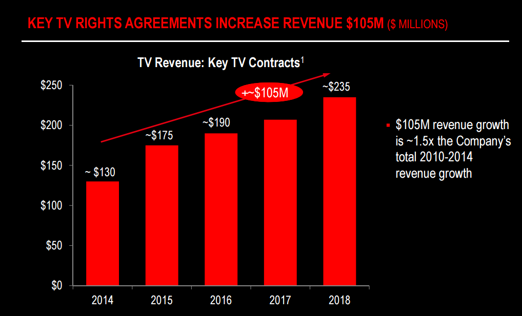For all of 2014, WWE earned $176.7M in television rights (which was 91% growth over where the company was in 2007). After just three quarters of 2015, WWE is already at $175.5M. WWE’s built-in escalators in the television contracts guarantees that the key agreements will continue to deliver more and more revenue for new programming through 2018/2019.