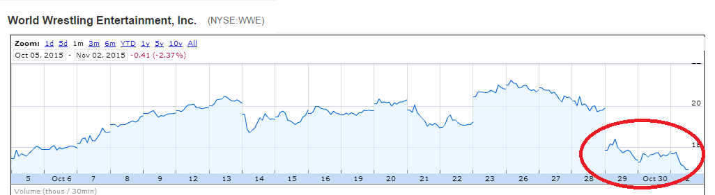 Prior to the earnings announcement, WWE was trading at $20/share. Since 10/29, $WWE has been trading at $17-$18/share. Investors seem frustrated that WWE projected flat WWE Network numbers for Q4 (though that shouldn’t really have been surprising), lower-than-expected cash flow ($4M-$8M is half of what Wall Street expected) and exceptionally vague 2016 guidance on the WWE Network.